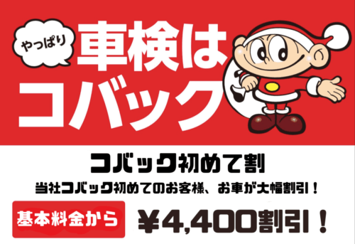 当社コバックのご利用が初めてのお客様、お車にはスーパーセーフティパック車検をご予約いただきますと、コバック初めて割¥4,400を割引いたします。 コバック新津店、安田IC店、五泉店3店舗にてご利用いただけます。 注意事項 […]