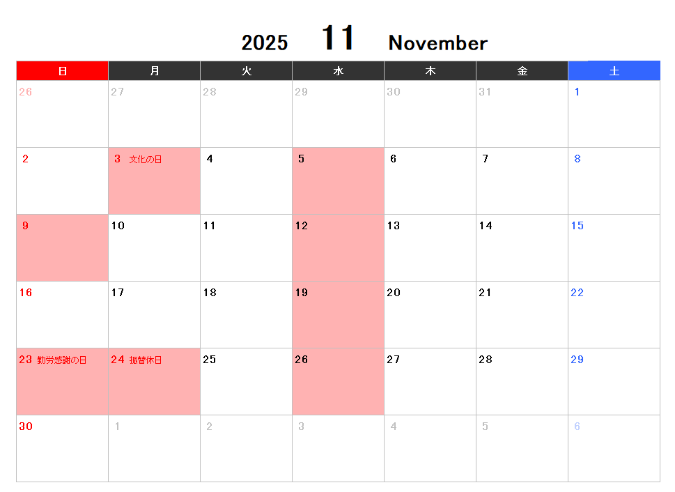 11月のお休み 2025-10-25 お知らせ みなさんこんにちは♪ コバック安田IC店の11月のお休みをお知らせいたします。 11月は、第1・3・5日曜日 営業いたします! 何卒よろしくお願いいたします。